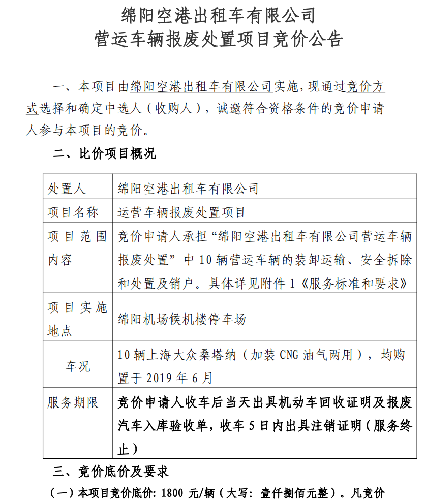 綿陽空港出租車有限公司營運車輛報廢處置項目競價公告