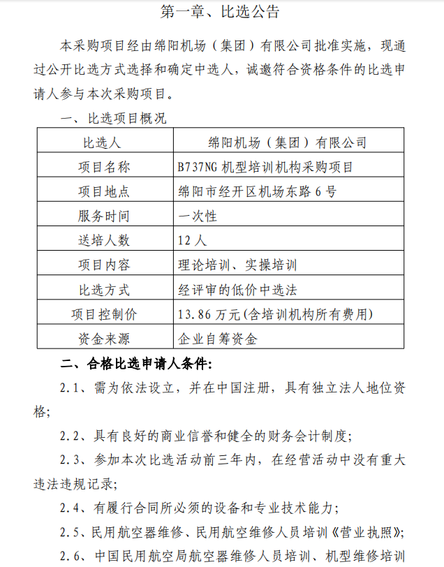 綿陽機(jī)場B737NG機(jī)型培訓(xùn)機(jī)構(gòu)采購項目比選公告